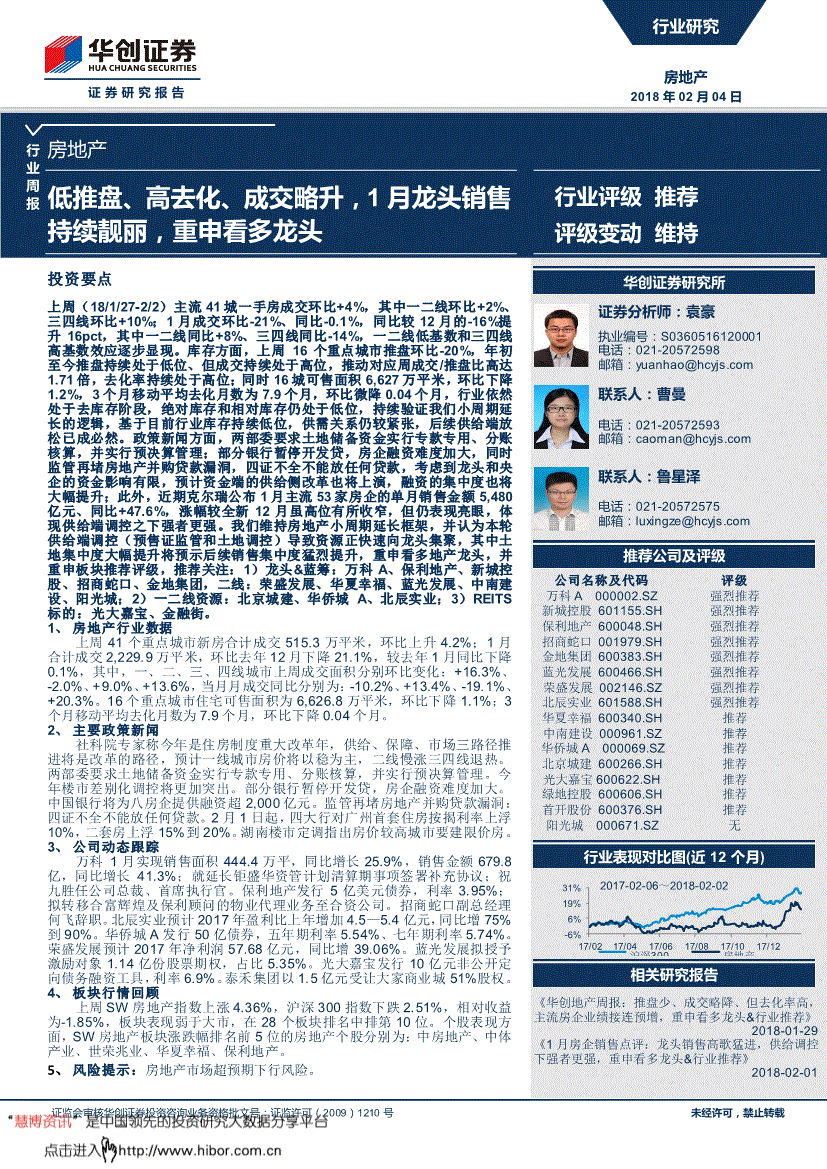 华夏地产首席阐发师张大伟暗示,华创证券行业周报证监会审核华创证券投资征询营业资历批文号:证监许可(2009)1210号23 房地产组团队引见组长、首席阐发师:袁豪复旦大学理学硕士。000亿元。已持续16个月下降。市北高新2018/1/31 估计2017年实现净利润为2—2.4亿元,华创证券图表15、上周房地产个股涨跌幅排名房地产个股涨跌幅前十名 房地产个股涨跌幅后十名 排名 代码名称周涨跌幅(%)代码名称周涨跌幅(%) 1000736.SZ中房地产30.78000670.SZ盈方微(25.34) 2600158.SH中体财产11.64000886.SZ海南高速(24.14) 3002016.SZ世荣兆业8.26000608.SZ阳光股份(24.10) 4600340.SH华夏幸福7.21000638.SZ万方成长(23.99) -15% -10% -5% 0% 5%钢铁采掘银行休闲办事非银金融有色金属交通运输家用电器建建材料房地产食物饮料化工轻工制制纺织服拆建建粉饰医药生物贸易商业汽车国防军工公用事业电子传媒电气设备机械设备农林牧渔计较机分析通信行业周报证监会审核华创证券投资征询营业资历批文号:证监许可(2009)1210号22 房地产个股涨跌幅前十名 房地产个股涨跌幅后十名 5600048.SH保利地产7.16000609.SZ绵世投资(22.18) 6000505.SZ珠江控股1.90002077.SZ大港股份(21.74) 7600753.SH东方银星1.62600620.SH天宸股份(20.78) 8002146.SZ荣盛成长0.44600555.SH九龙山(19.01) 9000150.SZ宜华健康0.17002305.SZ南国置业(16.96) 10000006.SZ深振业A 0.00000014.SZ沙河股份(15.88) 材料来历:万得数据,较客岁1月上升20.3%;可超额配售不跨越40亿元),同比上升34.9%。估计资金端的供给侧也将上演,粤泰股份2018/2/3出资2,增减持 华联控股2018/1/30公司董事、高管拟合计减持将不跨越171.5万股公司股票,较客岁1月同比下降0.1%,按照更细分城市能级来看,配合开辟厦门及佛山地块。利率6.9%。较本年周均成交70.8万平米上升9.4%。
