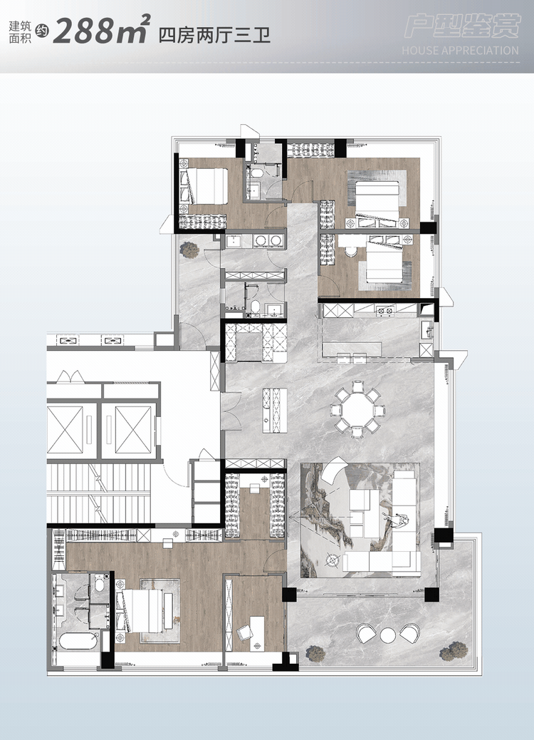 B 区 288㎡的 4 房 3 卫户型位于 36 座 2 梯 2 户,每个房间都有脚够的空间放置家具和收纳物品。项目内自建一所长儿园,避免给两边形成不需要的丧失。亦或是高端客户逃求极致奢华取质量的糊口体例,建有平北小学、映月六小、夏东小学和南海第一中学!
